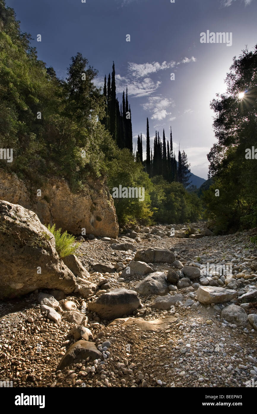 3½ h / 250 m ↑ 150 m ↓ 3.tag: Schnell sind wir am fuss der schlucht angekommen und befinden uns nun in einem flussbett. Hohe berggipfel, imposante schluchten, blumenreiche bergzüge und karge landstriche bieten vielfalt pur! Griechenland, peloponnes, rindomo schlucht bei kalamata, steinigers flußbett in der schlucht, 3. Von kalamata aus fahren wir nach kambos auf den mani, den mittelfinger.